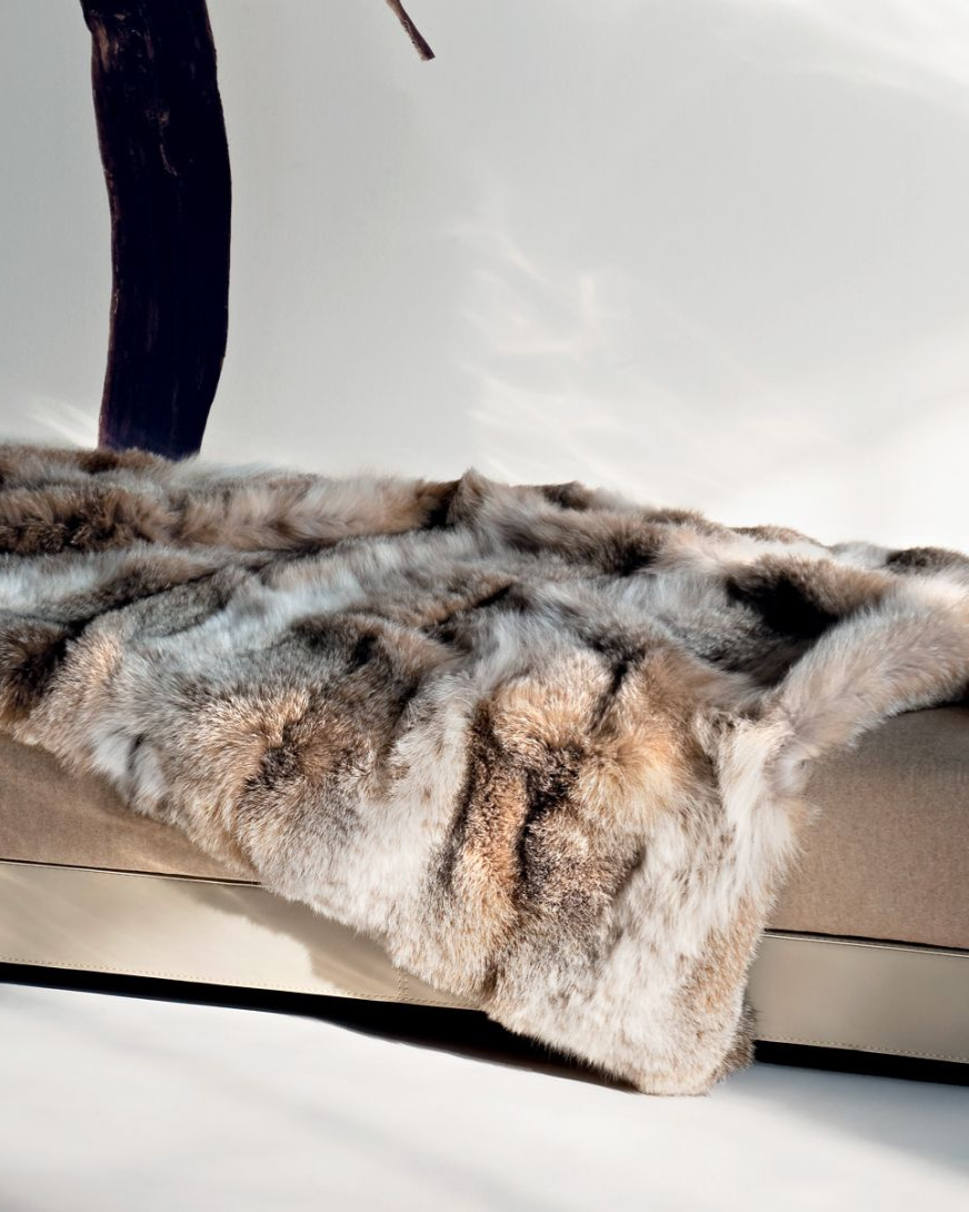 Koc Enchanté Lynx – wykonany z ekskluzywnego futra rysia holenderskiego, zachwyca niezwykłą miękkością oraz wyjątkową zdolnością do otulania ciepłem i komfortem. Jego szlachetna, pełna głębi kolorystyka – od naturalnych tonów po subtelne odcienie mélangé – sprawia, że każda przestrzeń zyskuje spektakularny, wyrafinowany charakter.