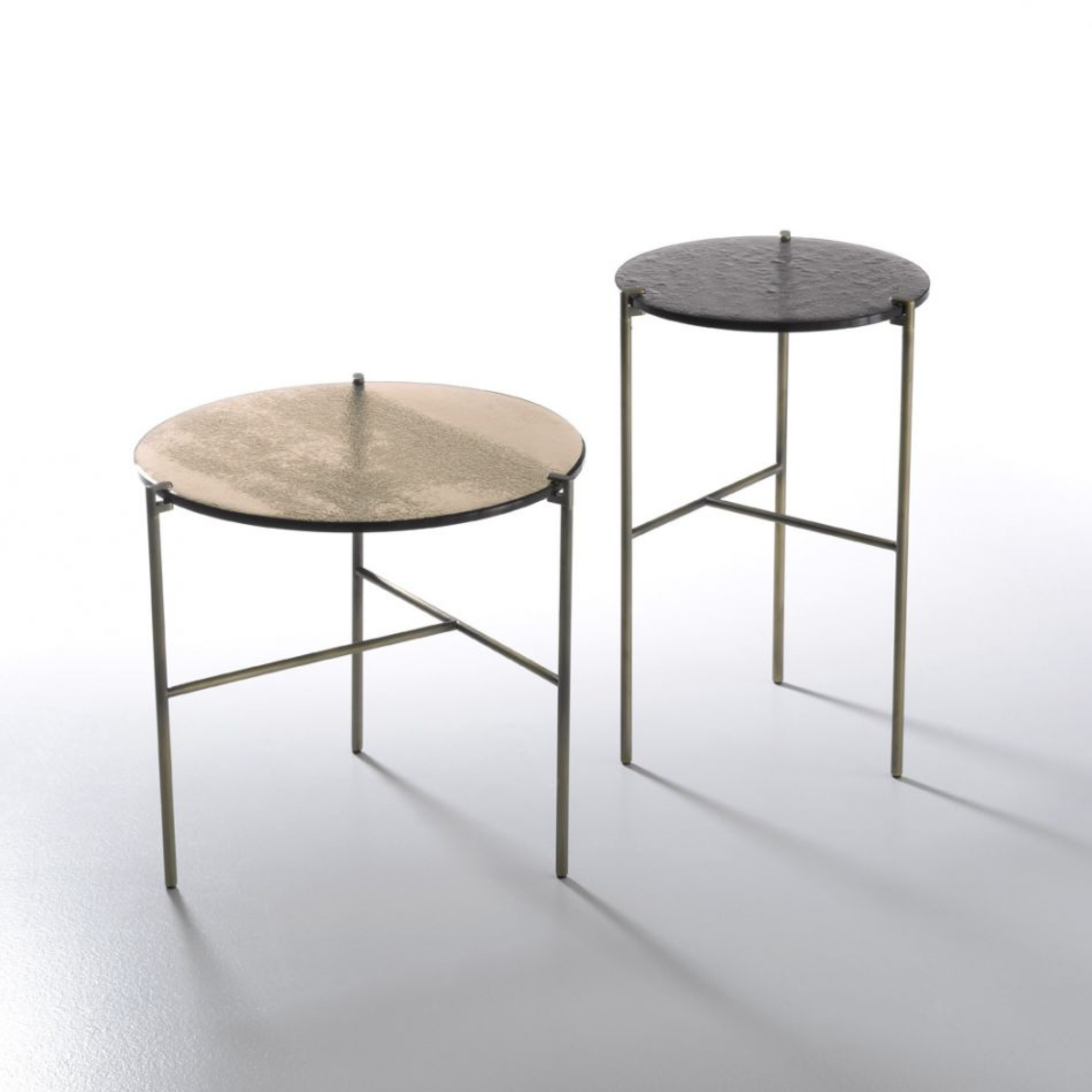 Stoliki Antitesi marki Ivano Redaelli to połączenie sztuki i designu w najczystszej formie. Smukła rama z mosiądzu podtrzymuje wyjątkowy blat ze szkła, powstały w wyniku połączenia trzech warstw o różnych kolorach.