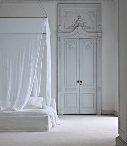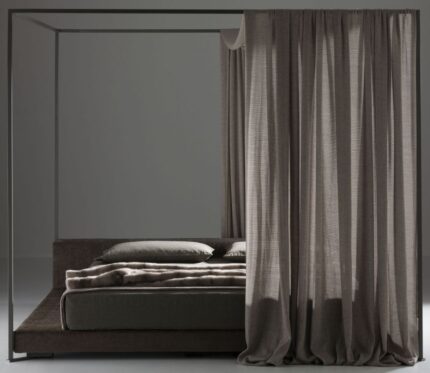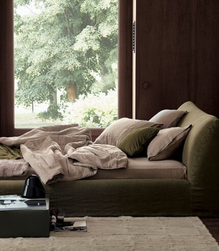 Łóżko Avedon dostępne jest w dwóch wersjach zagłówka — z jedną dużą poduszką lub z dwiema oddzielnymi, które mogą być wyposażone w skórzane paski lub pozostać bez nich. Wszystkie elementy można zamówić w pełnej gamie tkanin i kolorów z kolekcji Ivano Redaelli.