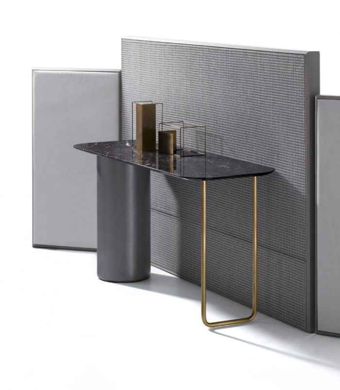 Duncan to niezwykle wszechstronny i niekonwencjonalny mebel, który doskonale odnajdzie się w różnych przestrzeniach. Ustawiony w holu lub salonie pełni funkcję eleganckiej konsoli, natomiast umieszczony za łóżkiem stojącym na środku pokoju może służyć jako stylowe biurko lub toaletka. Nogi wykonane z lakierowanego metalu i postarzanego mosiądzu harmonijnie łączą się z blatem z szlachetnego marmuru z kolekcji Ivano Redaelli, tworząc mebel o wyjątkowym charakterze i ponadczasowej elegancji.
