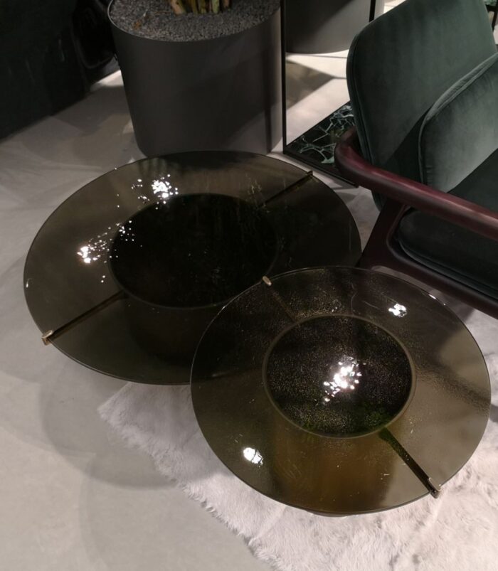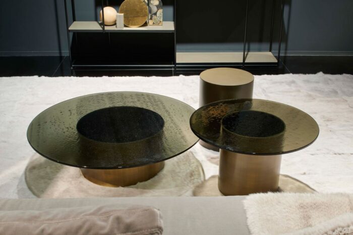 Podstawa w wykończeniu z brązowanego mosiądzu harmonijnie komponuje się z transparentnym blatem, wykonanym ze szkła powstałego w wyniku stapiania trzech warstw o różnych kolorach.