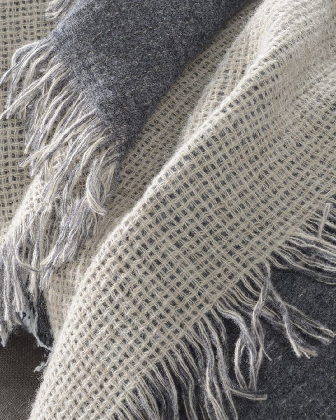 Pled Fil Rouge wyróżnia się unikalnymi cechami: z jednej strony gładki kolor z efektem melanżu, z drugiej specjalna struktura siateczki, tworząca podwójny kontrast – kolorystyczny i techniczny. Wykonany z miękkiej, otulającej czystej wełny dziewiczej, Fil Rouge doskonale nadaje się zarówno do dekoracji salonu, jak i oryginalnej, stylowej sypialni.