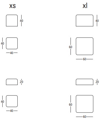 XS: 40×40 cm, wysokość 40 cm lub 20 cm