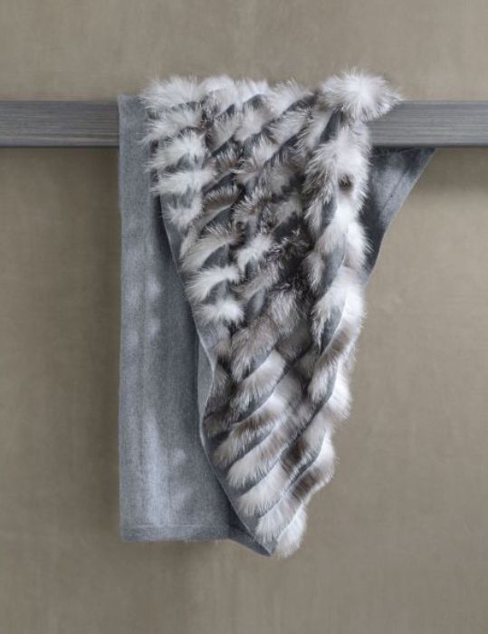 Ekskluzywny pled R48 Philly wykonany z futra srebrnego lisa na bazie tricotowego kaszmiru w płaskim splocie. Zastosowano wyrafinowaną obróbkę futra, inspirowaną światem haute couture. Miękki, ultralekki i niezwykle modny – wyjątkowy pled dla prawdziwych koneserów luksusu.