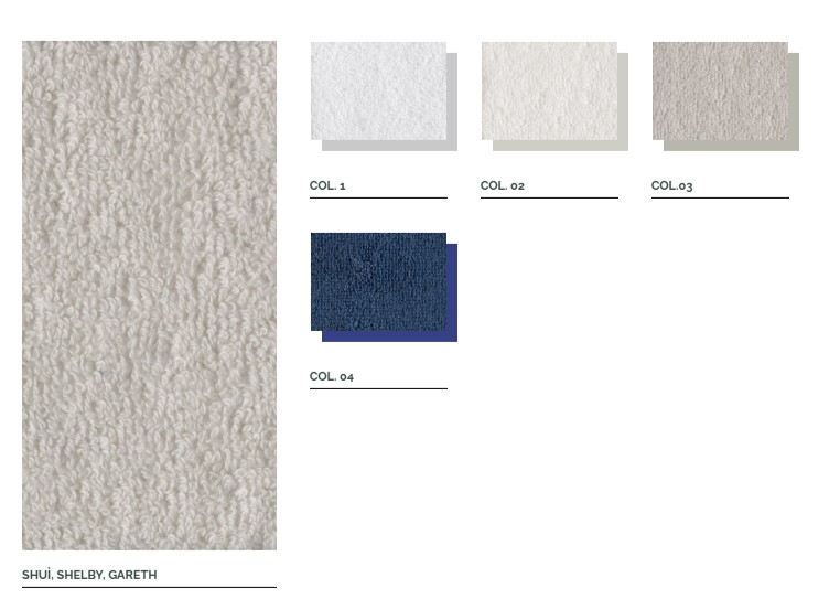 Shuì, Shelby, Gareth to elegancka linia ręczników wykonanych z miękkiej bawełny typu terry o gramaturze 350 g/m², stworzona z myślą o przestrzeniach na świeżym powietrzu, ale równie doskonała do wnętrz. Ręczniki są poddane obróbce Indanthrene, co czyni je wyjątkowo odpornymi na chlor, słońce, wodę morską i częste pranie.