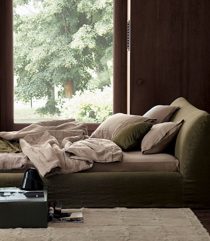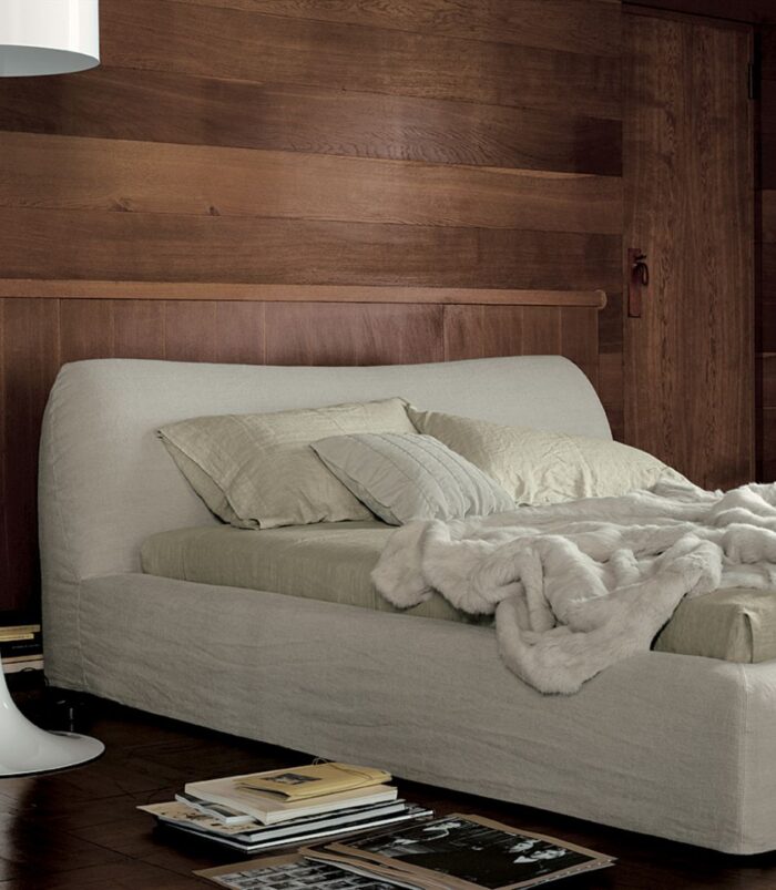 Wyrafinowane przeszycia podkreślające kształt łóżka nawiązują do świata luksusowego, rzemieślniczego krawiectwa, w którym elegancja łączy się z funkcjonalnością.